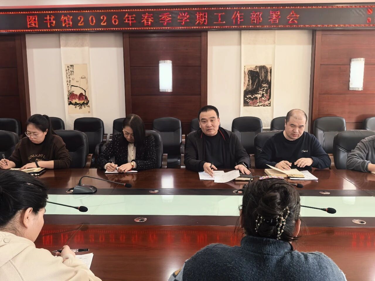 3月16日下午,图书馆在210会议室召开2026年春季学期工作部署会,会议由馆长张洪彪主持,全体馆员参会。